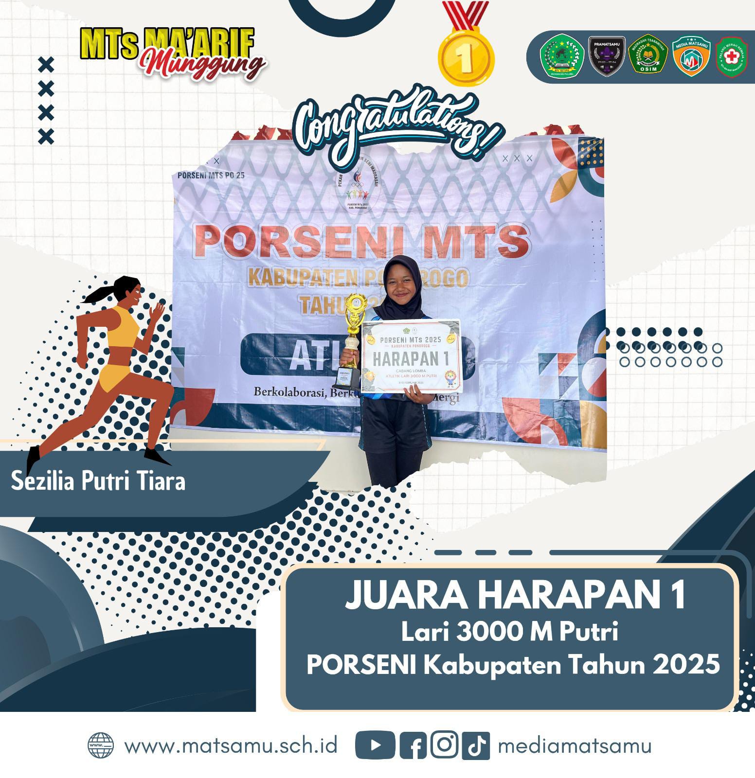 #PORSENIKabupaten2025 #JuaraHarapan1 #Lari3000M #SeziliaPutriTiara #MtsMaarifMunggung #MadrasahHebatBermartabat #PrestasiSiswa #SemangatOlahraga”