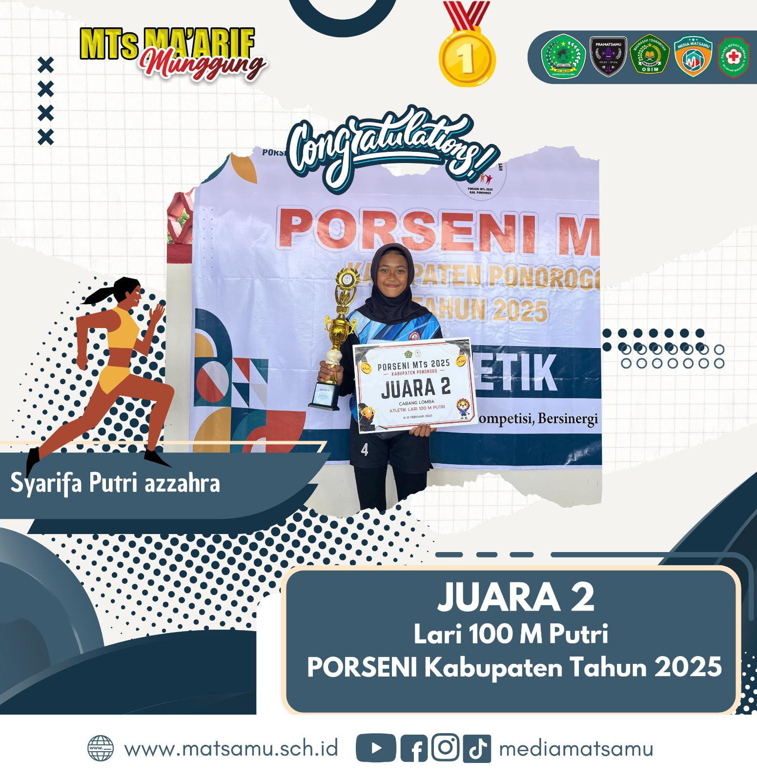 Segenap keluarga besar MTs Ma’arif Munggung dengan rasa bangga dan sukacita mengucapkan CONGRATULATIONS! serta selamat dan sukses yang luar biasa kepada ananda Syarifa Putri Azzahra yang telah berhasil meraih JUARA 2 dalam cabang olahraga Lari 100 Meter Putri pada ajang bergengsi Pekan Olah Raga & Seni (PORSENI) Madrasah Tsanawiyah Tingkat Kabupaten Tahun 2025!