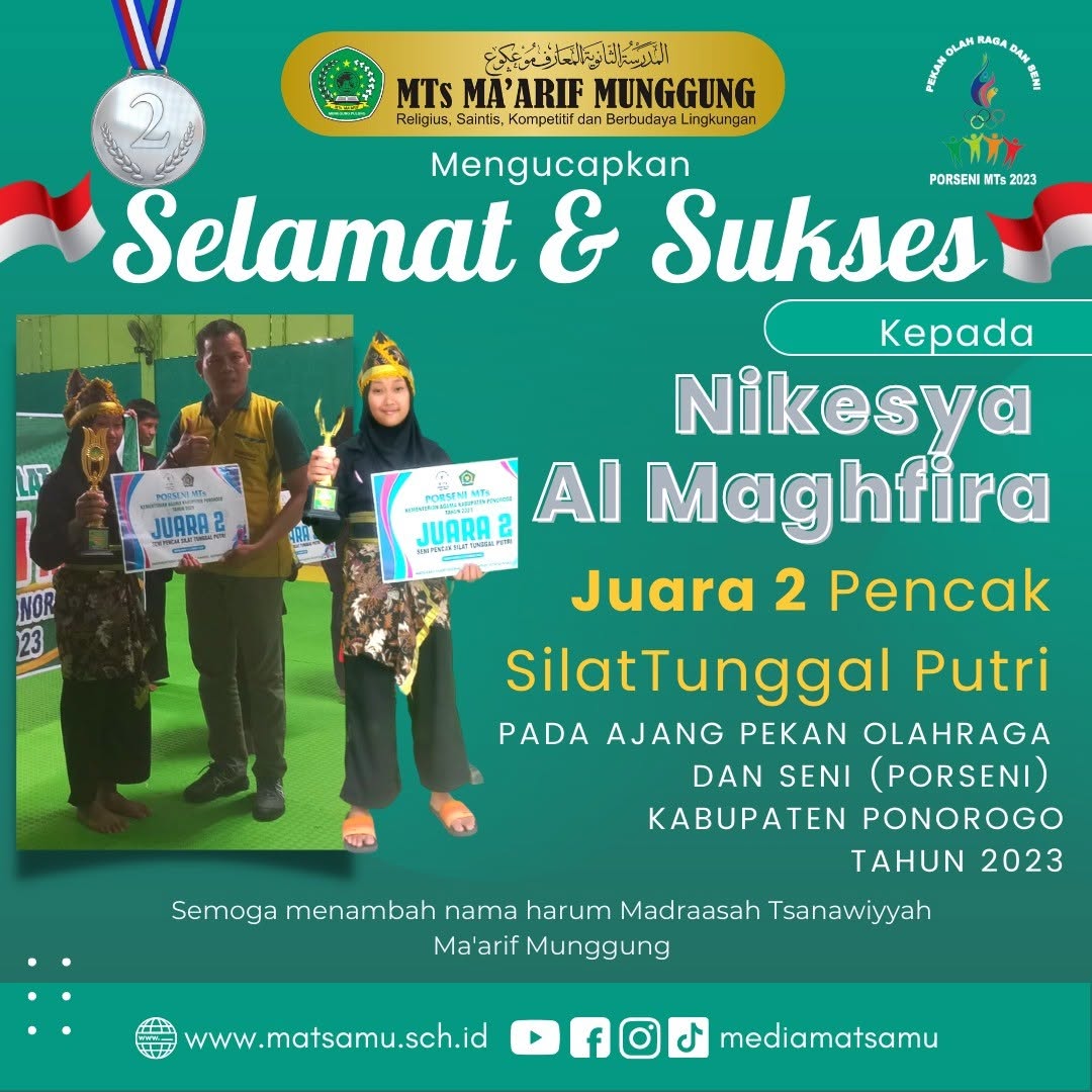 Terima kasih yang sebesar-besarnya kami sampaikan kepada Nikesya Al Maghfira atas prestasinya yang telah mengharumkan nama MTs Ma’arif Munggung, para pelatih yang telah membimbing dengan penuh kesabaran, serta seluruh pihak yang telah memberikan dukungan dan motivasi.