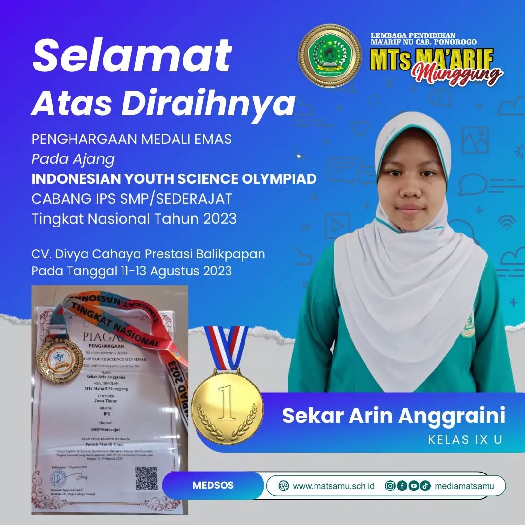 #MedaliEmas #IndonesianYouthScienceOlympiad #IYSO2023 #IPS #TingkatNasional #SekarArinAnggraini #KelasIXU #MtsMaarifMunggung #MadrasahHebatBermartabat #PrestasiSiswa #BanggaMadrasah”
